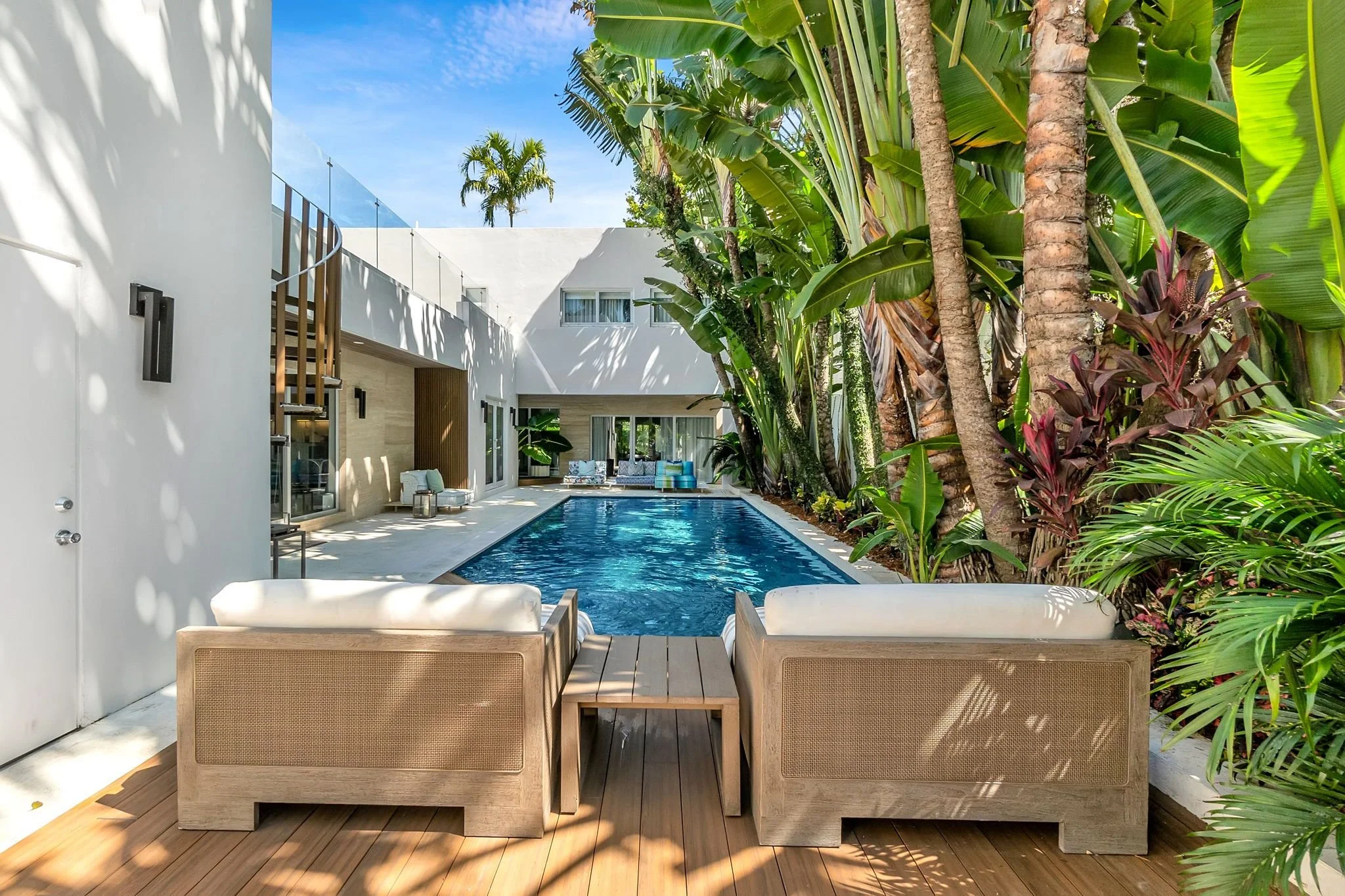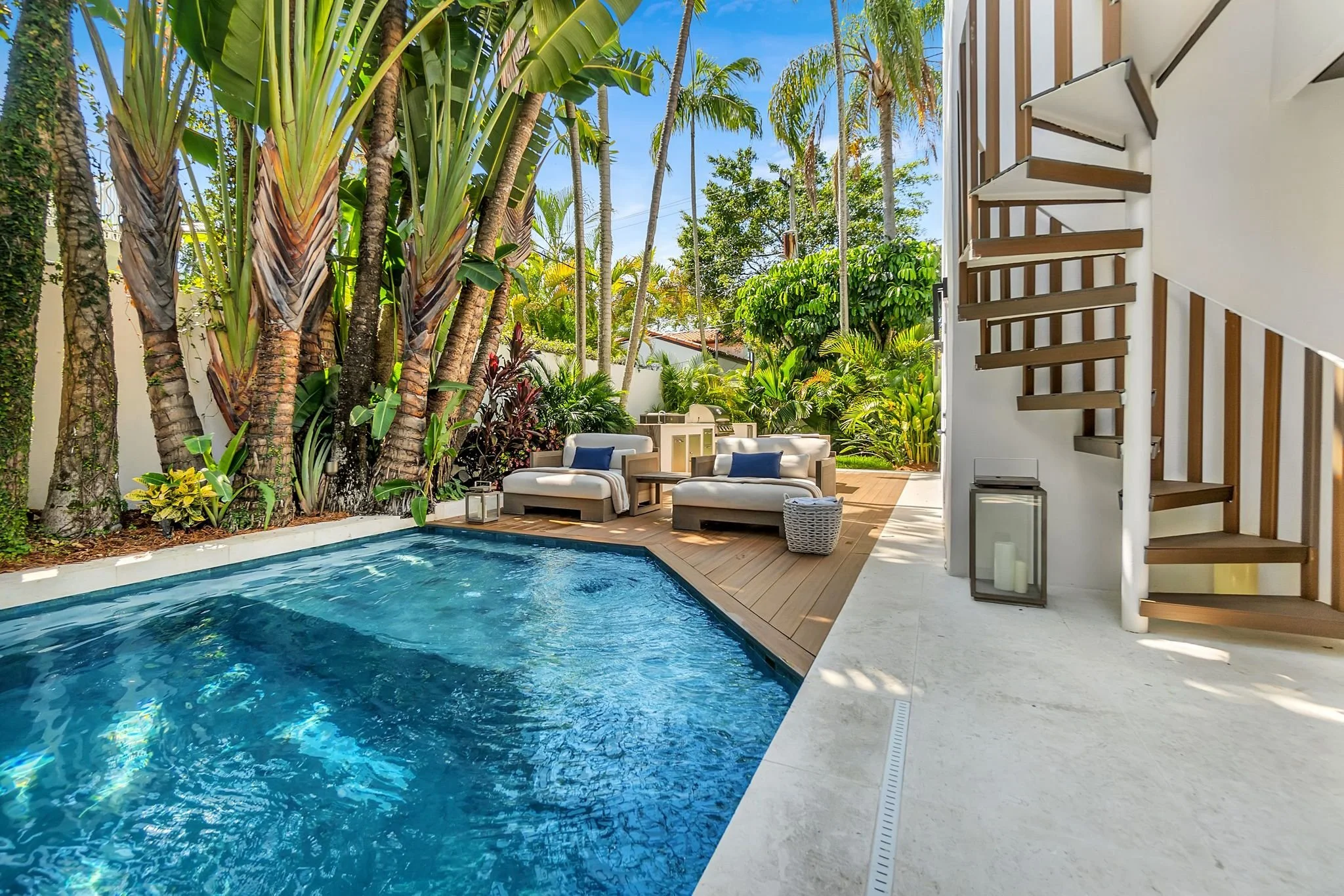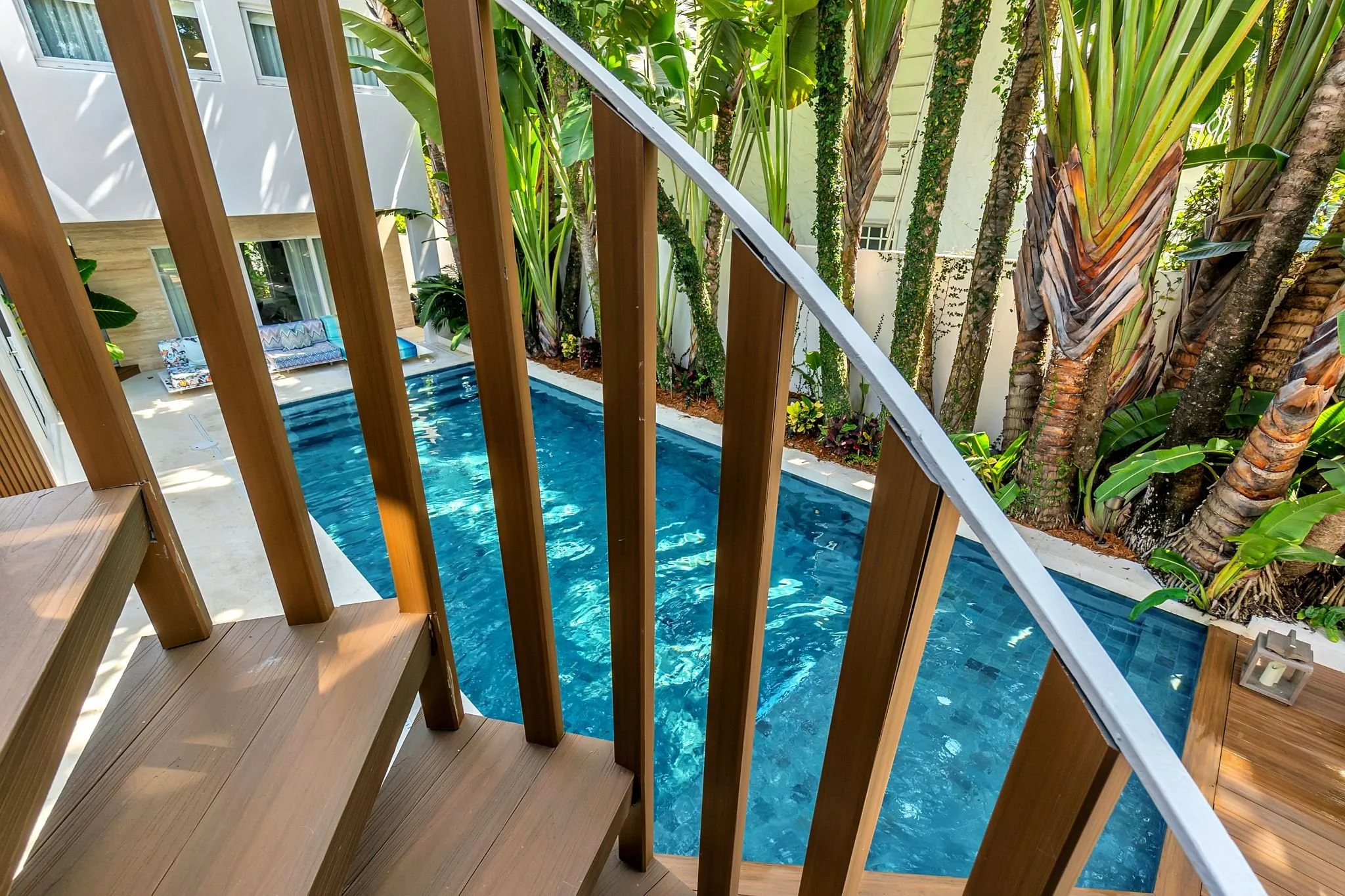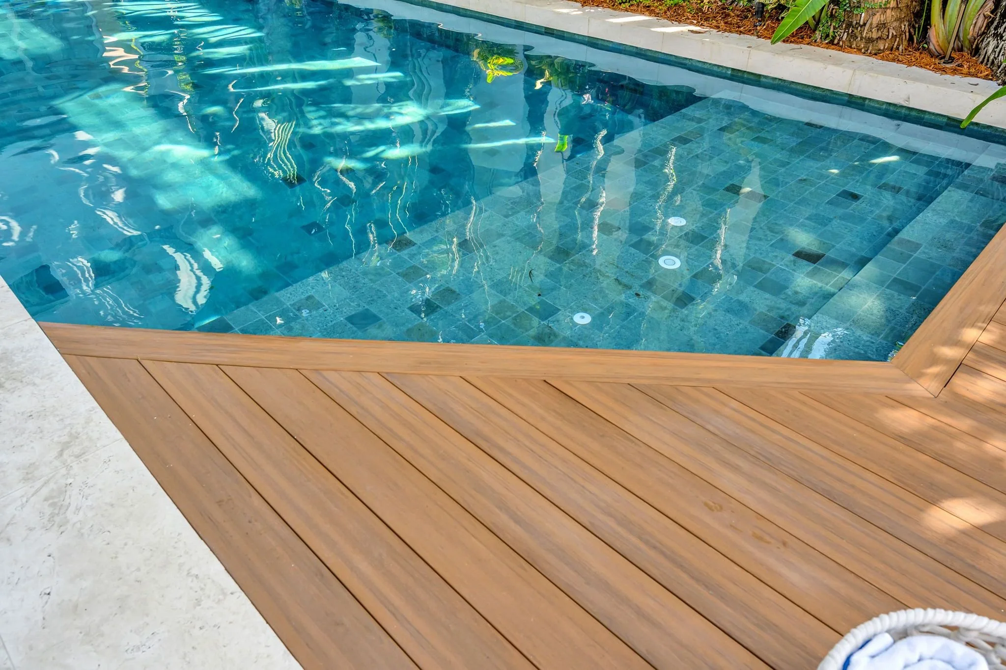 By modernizing the pool with natural stone and travertine marble, adding a sleek glass railing, and constructing a composite wood deck, we aim to create a luxurious and relaxing space.